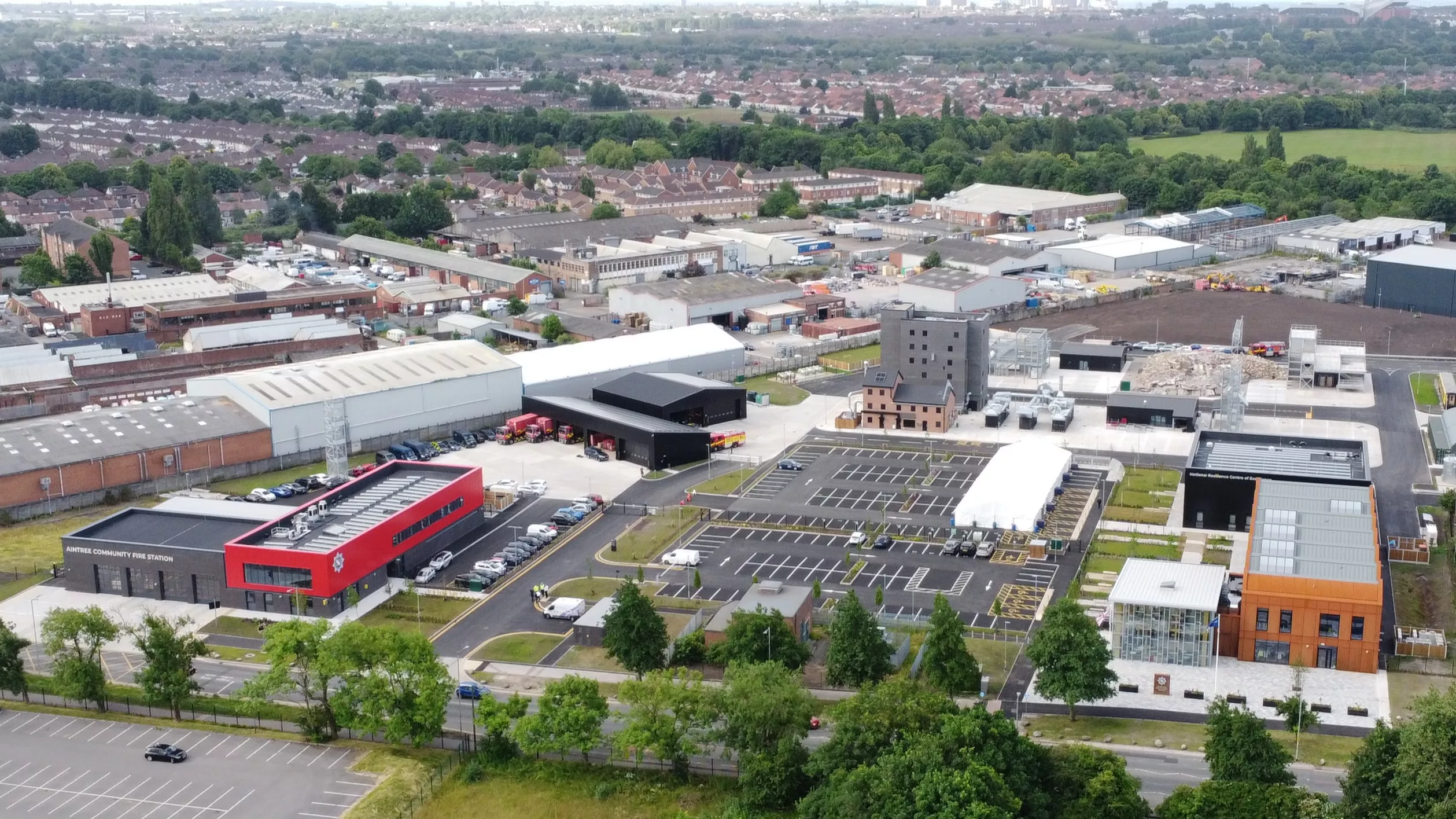 The first service is the distinctive red-clad Aintree Community Fire Station, a 4-bay, multi-pump operational base responding to local emergencies. The decision to build it rationalised and updated two much older fire stations, one elsewhere in Aintree, the other in Croxteth.