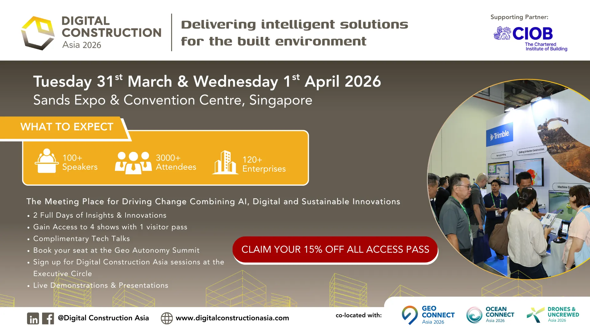 Digital Construction Asia 2026 focuses on accelerating change in the construction industry across the Southeast Asian region with the theme “Delivering intelligent solutions for the built environment”. The event will be held alongside Geo Connect Asia on 31st March & 1st April at Sands Expo & Convention Centre, Singapore.